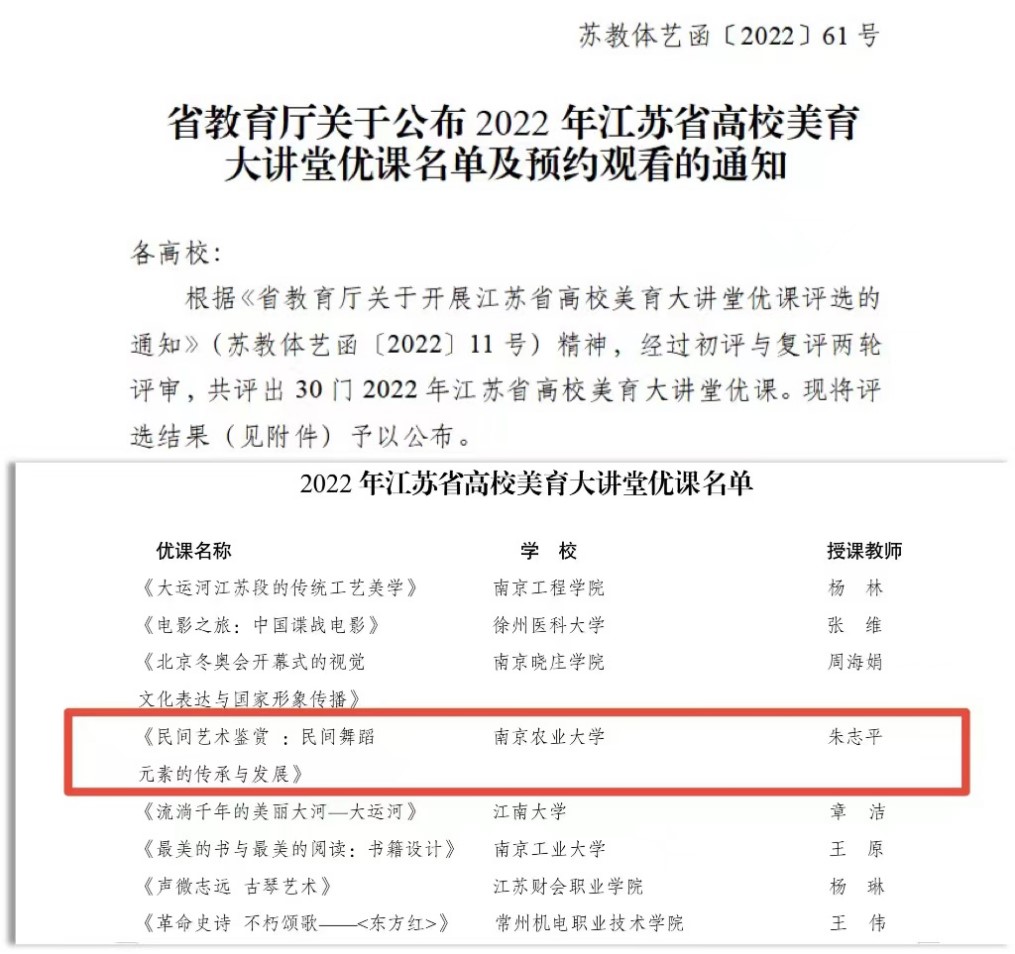 艺术系朱志平副教授的《民间舞蹈元素的传承与发展》课程,成功入选江苏省高校美育大讲堂优课。